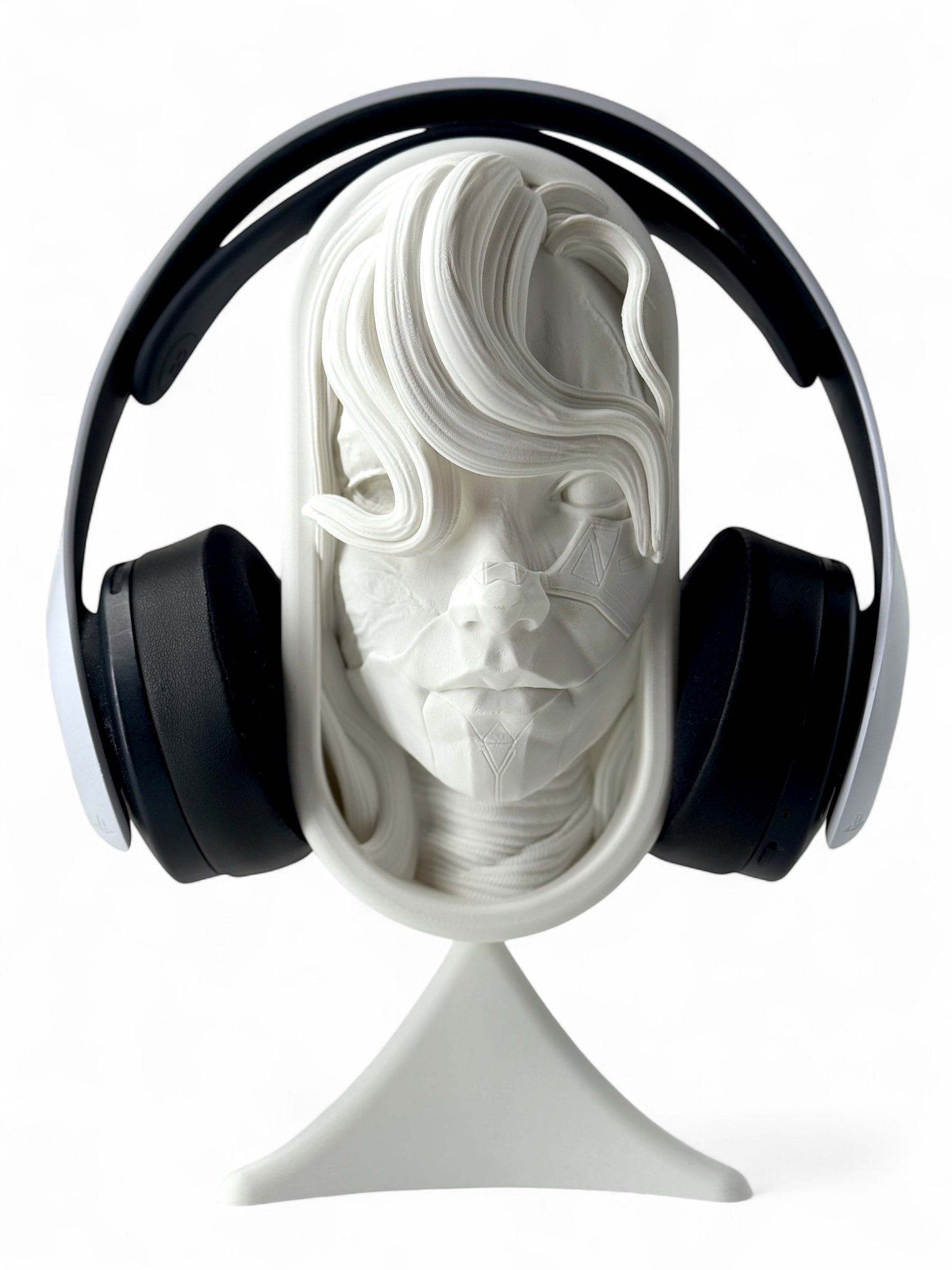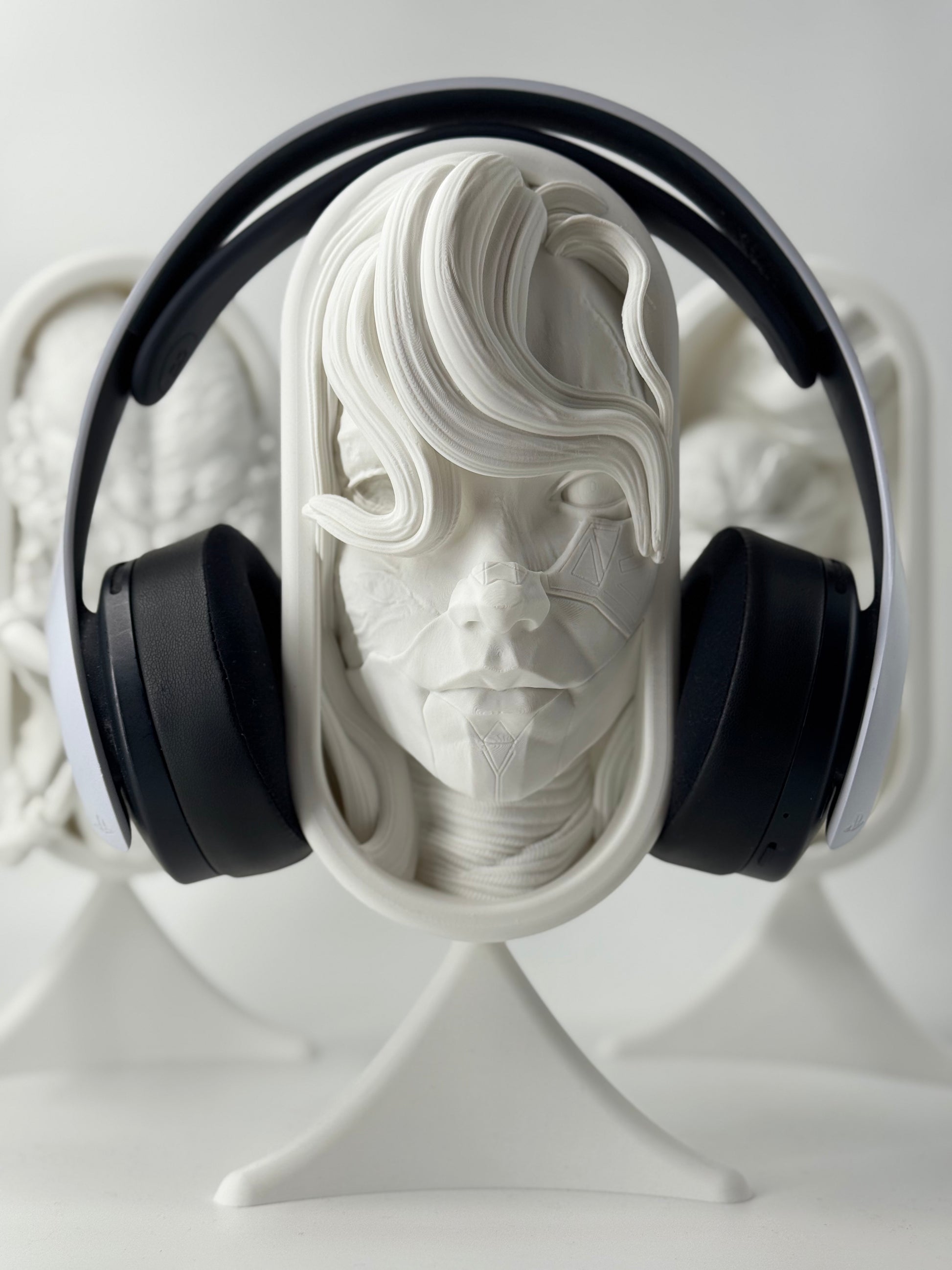 With flowing hair, geometric facial markings, and serene expression, Alicia embodies both strength and mystery. The stand merges fluid form with functionality, offering a graceful resting place for your headphones while transforming your setup into a scene from a dreamlike world.